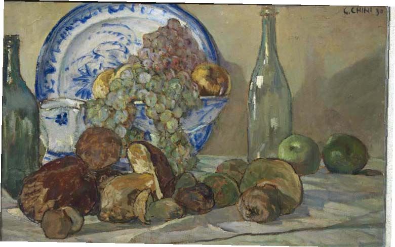 NATURA MORTA CON FRUTTA, FUNGHI, BOTTIGLIA E PIATTO