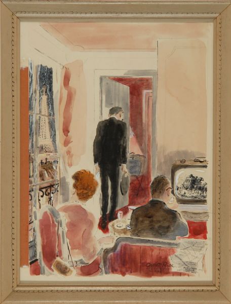 | An American couple in a Paris hotel, one viewing American Western television and one viewing the Eiffel Tower | |