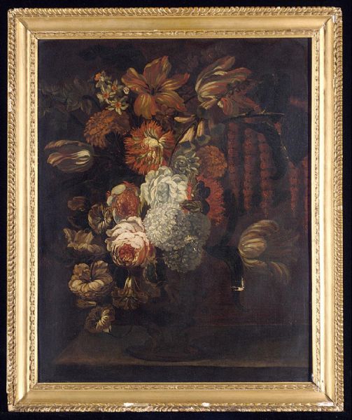 | STILL LIFE WITH ROSES, TULIPS, AND OTHER FLOWERS IN A SCULPTED VASE ON A LEDGE | |