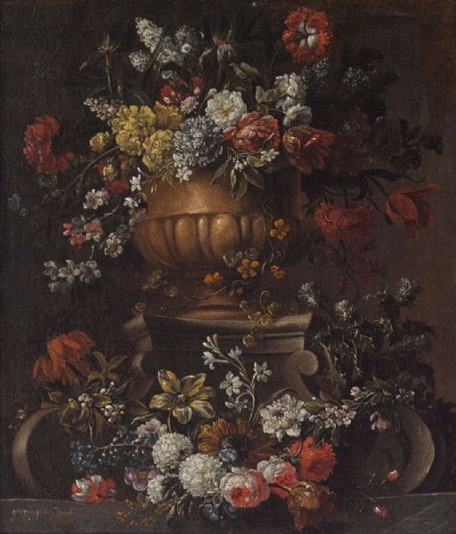 Blumenstillleben in einer Terrakottavase auf Volutensockel