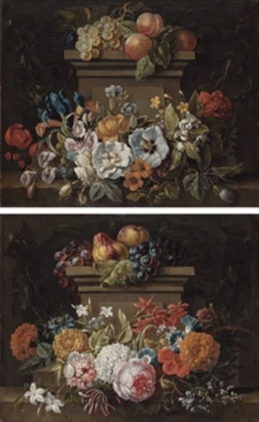 | A swag of flowers in a niche, with grapes, plums and peaches on a plinth; and A swag of flowers in a niche, with pears and grape | |