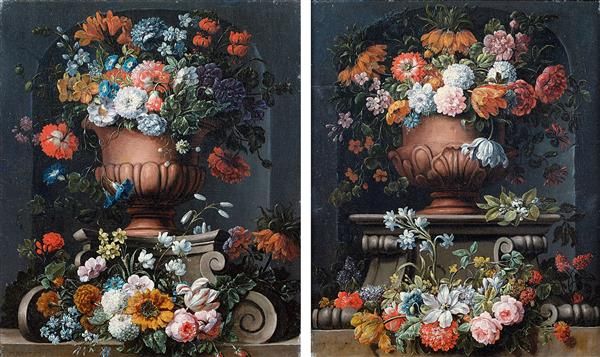| Bouquets de fleurs dans des vasques en pierre dans une niche | |