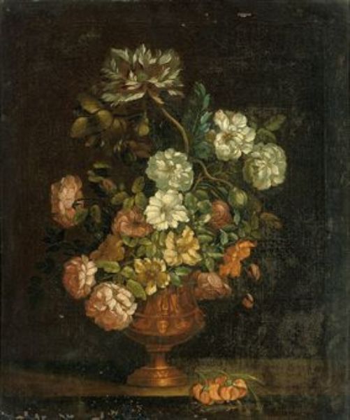 | Roses, chrysanthemums, and other flowers in a sculpted copper urn, on a stone ledge | |