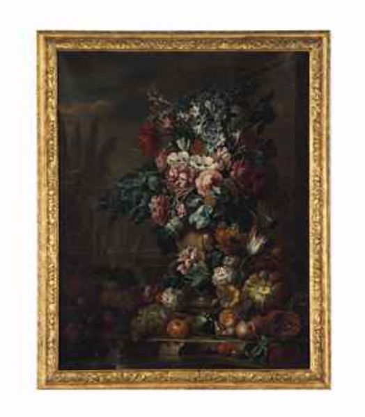 | Still life of flowers in a vase on a stone ledge with various fruits | |