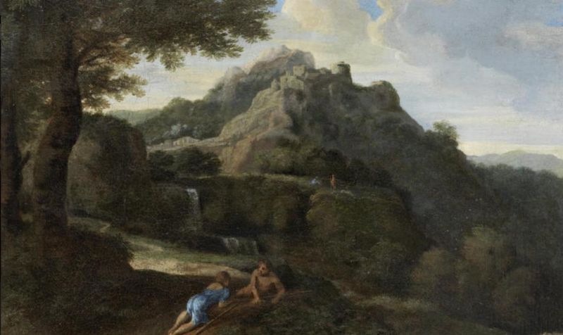 | Two figures resting in an Italianate landscape before a waterfall, with a village on the horizon | |