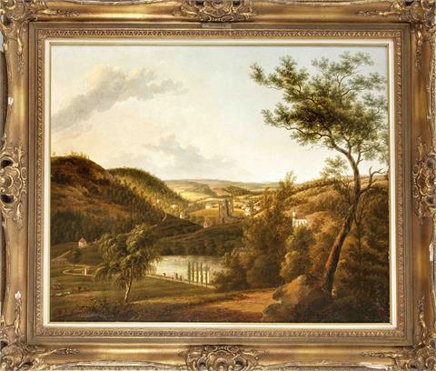 Landschaftsmaler, weite Hügellandschaft mit versprenkelten Häusern und einer Kirche sowie Spaziergängern an einem See