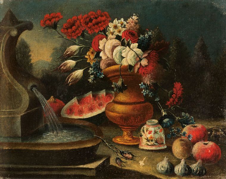 FIGS AND OTHER FRUITS NEAR A FOUNTAIN