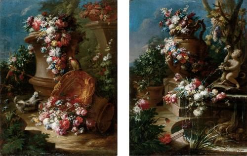 NATURE MORTE DI FIORI DECORANTI ANFORE E URNE IN UN GIARDINO