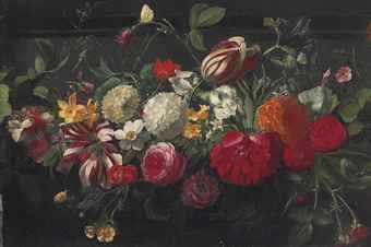 | A wreath of tulips, snowballs, irises, roses and other flowers, with a brimstone butterfly: a fragment | |