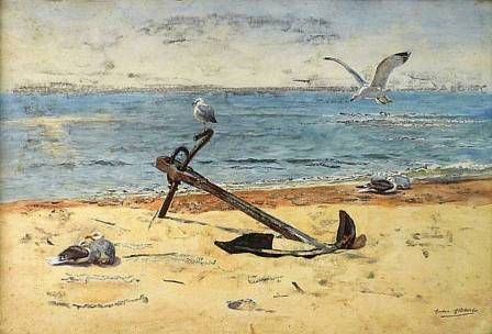 MOUETTES ET ANCRE SUR LA PLAGE