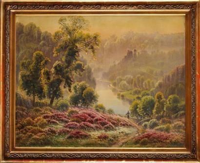 Paysage animé de bruyère et de rivière dans la brume