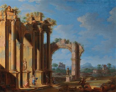 | A pair of antique architectural capriccios with numerous figures, | |