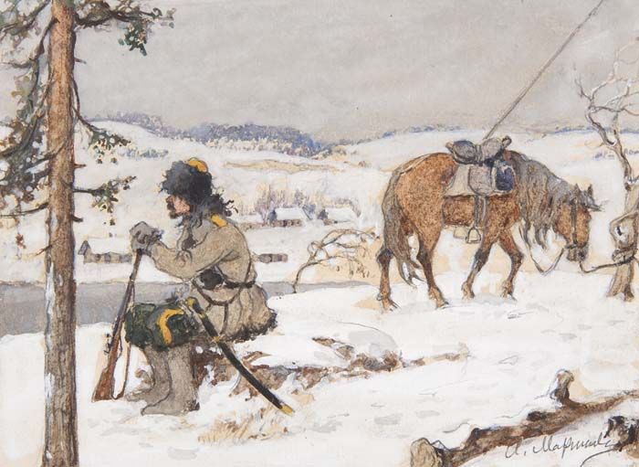 Sitzender Kosak mit Pferd im verschneiten Kasachstan