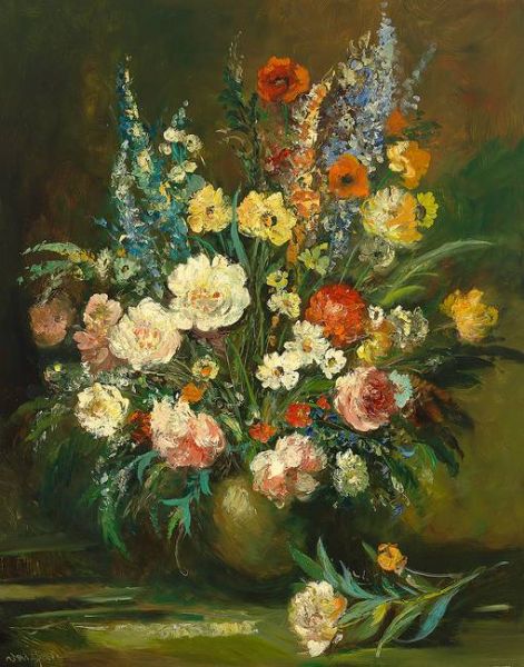 Prachtvoller Sommerblumenstrauß mit Rittersporn, Pfingstrosen, Mohn usw