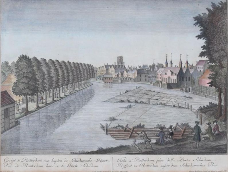 Ingekleurde opticaprent van Rotterdam. 'Gesigt te Rotterdam van buyten de Schieddamsche Poort'