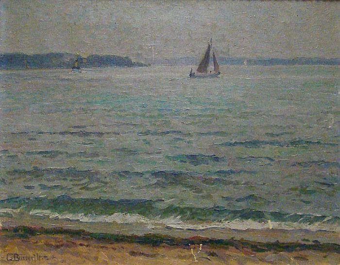 | Impressionistische Ansicht einer Seemündung mit Booten in der Dämmerung | |