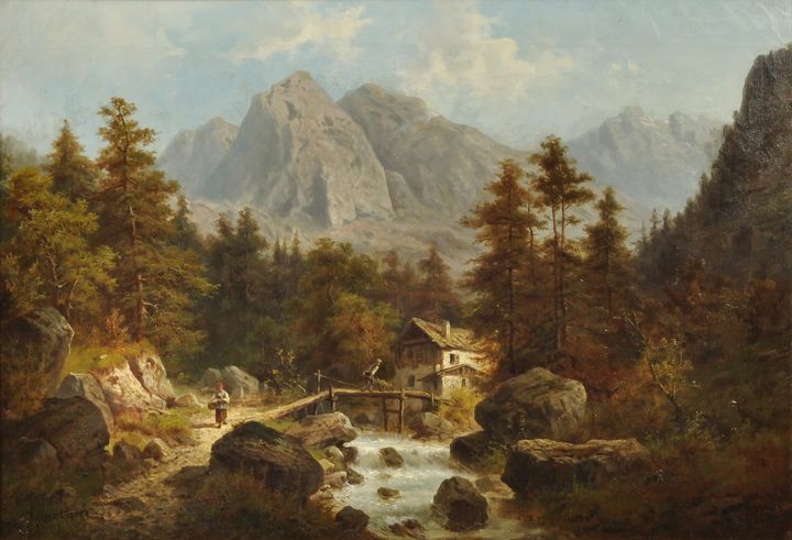 Alpenlandschaft mit Wildbach vor Felsmassiv