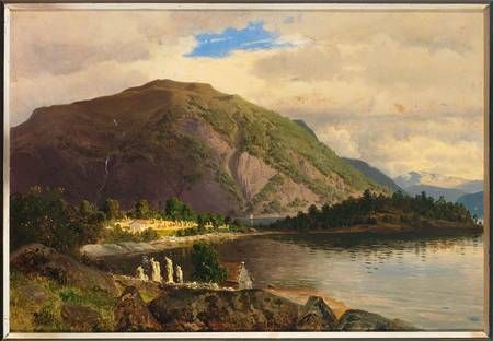 Sommerliche Landschaft mit bewaldetem Berg, Seeufer und zwei Hütten.