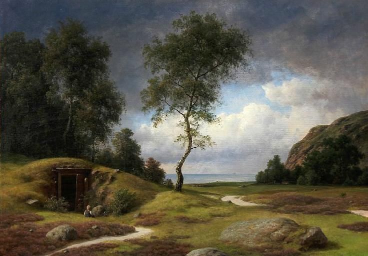 Landscape with a boy sitting in font of a burial mound