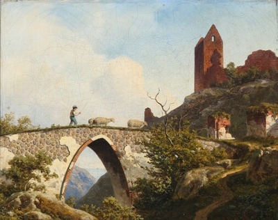 | View from Hammershus on Bornholm with a shepherd crossing a bridge. | |