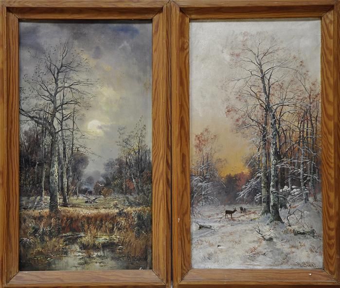 endants: Herbstlandschaft mit auffliegender Ente und Winterlandschaft mit Rotwild.