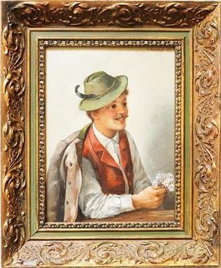 Halbportrait eines jungen Mannes mit Tirolerhut und Edelweißblüten in der Hand