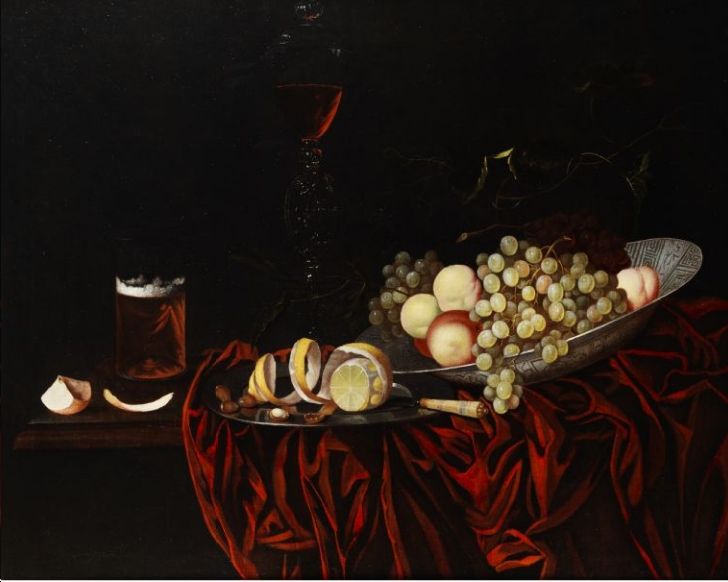 GROSSES FRÜCHTESTILLEBEN MIT GLASPOKAL, BIERGLAS UND ZITRONE