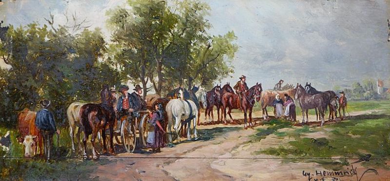 Pferdemarkt auf freier Wiese mit zahlreichen Bauern und Bäuerinnen.