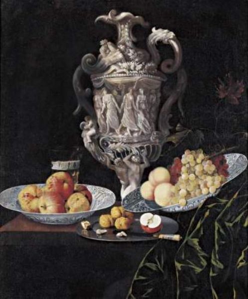 | STILL LIFE WITH AN ELABORATELY SCULPTED URN AND BLUE AND WHITE PORCELAIN BOWLS WITH FRUIT | |