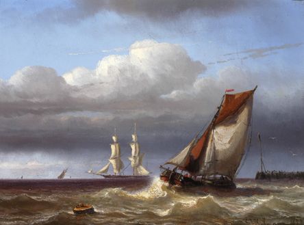 Uitvarend zeilschip met tweemaster op de achtergrond