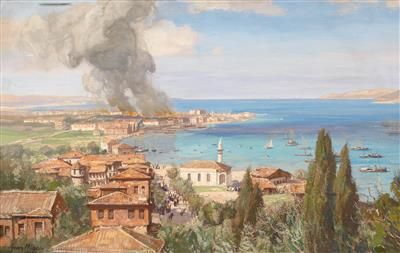 | Aus den Kämpfen um die Dardarnellen: Der Brand durch die Beschießung der englischen Flotte in Ischanat-Kale, Ende April | |
