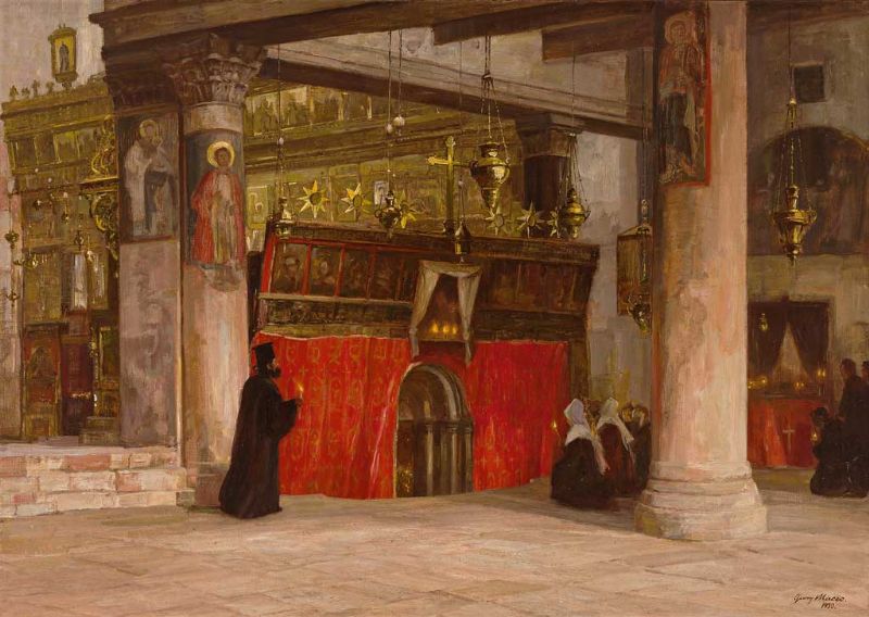 Blick in die Geburtskirche in Bethlehem mit Gläubigen und orthodoxem Priester.