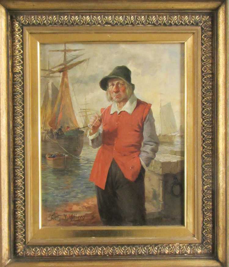 | Portrait of a man smoking a pipe standing at the harbor. | |
