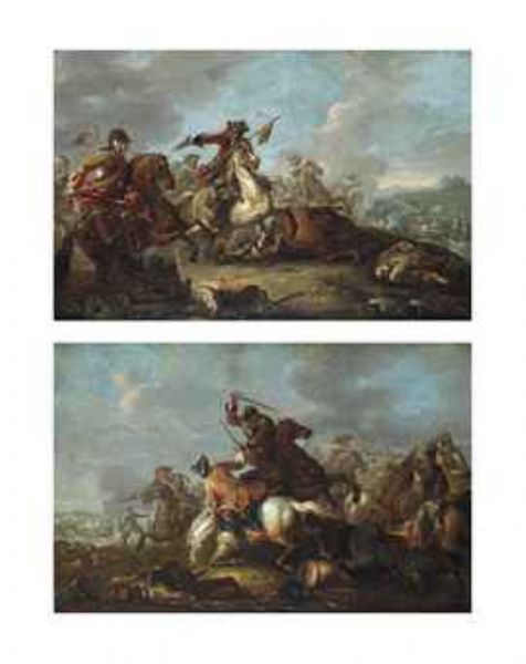 | A cavalry skirmish with a village on a hill beyond; and A cavalry battlefield | |