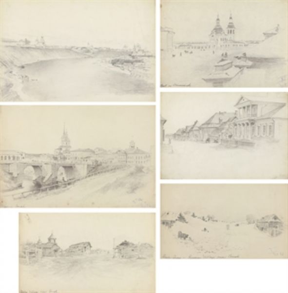 | A street in Minusinsk; View in Tomsk; Tartar street Semipalatinsk; Tyumen, the Tura River; A steppe village in Tomsk; and Deep S | |