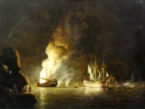 Man o' War lying at anchor in a fortified harbour, the scene lit by an explosion