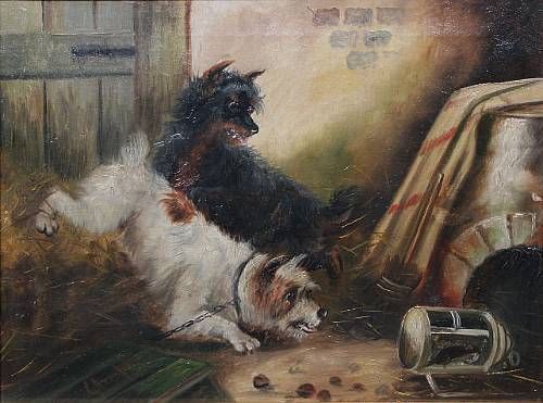 Terriers in a barn