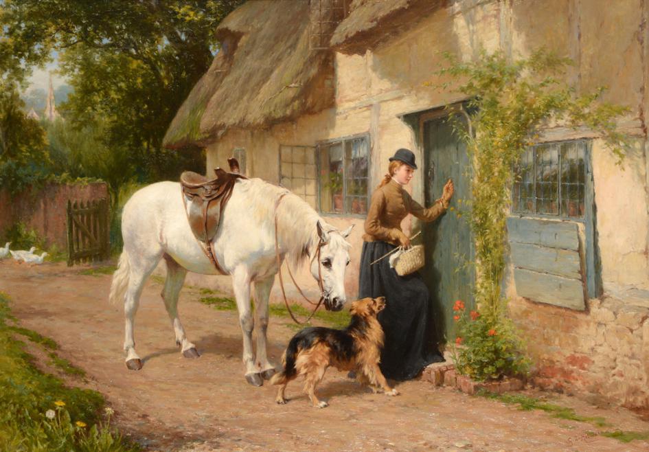 | An elegant young lady in riding attire at a cottage door | |