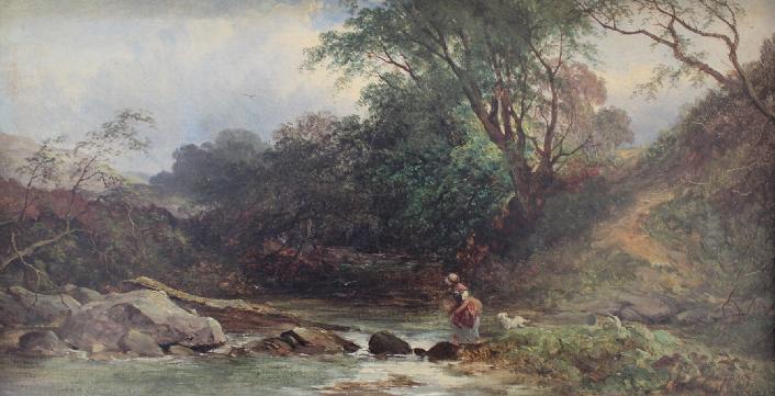 | RIVER SCENE WITH GIRL CROSSING STEPPING STONES | |