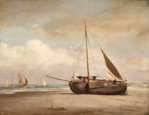 A Dutch lugger beached at low tide