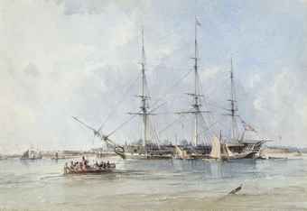 | The Blackwall frigate Seringapatam at anchor off Tilbury Fort | |