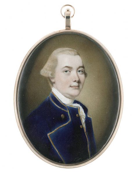 | Hugh Seton, wearing blue coat with gold piping and buttons, white frilled chemise and stock, his powdered wig worn en queue. | |