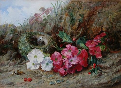 | Pink and white primula, a bird's nest and a sprig of holly against a mossy bank | |