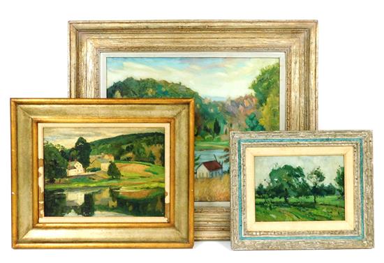 | View of springtime river with gray and red roofed cottages visible in middle ground | |