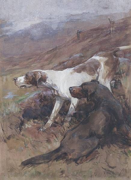 | A hunting party on a moor; A Setter and a Pointer working on a moor | |