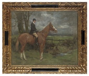 | A huntsman on a chestnut horse in an extensive landscape | |