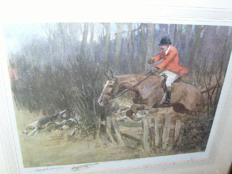 | Showing a hunting scene with huntsmen clearing a fence accompanied by hounds | |