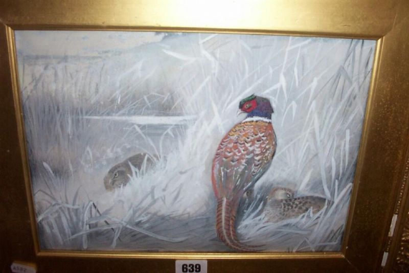 | study of a cock and two hen pheasants sheltering amongst water reeds | |