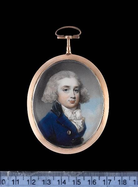 | A Gentleman, wearing blue coat with black collar and brass buttons, over white waistcoat and frilled white cravat, his hair powd | |