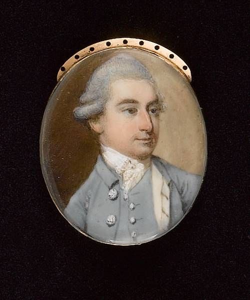 | A Gentleman, wearing pale blue coat with silver buttons, matching waistcoat, frilled chemise, tied cravat and powdered wig. | |